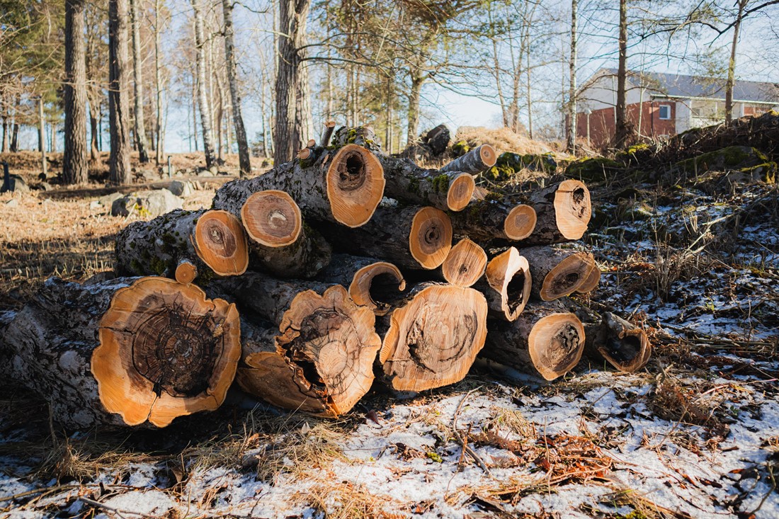 Ved från fallna och nedtagna träd på Östhammarshems fastigheter tas till vara som faunadepåer i samarbete med Peab.